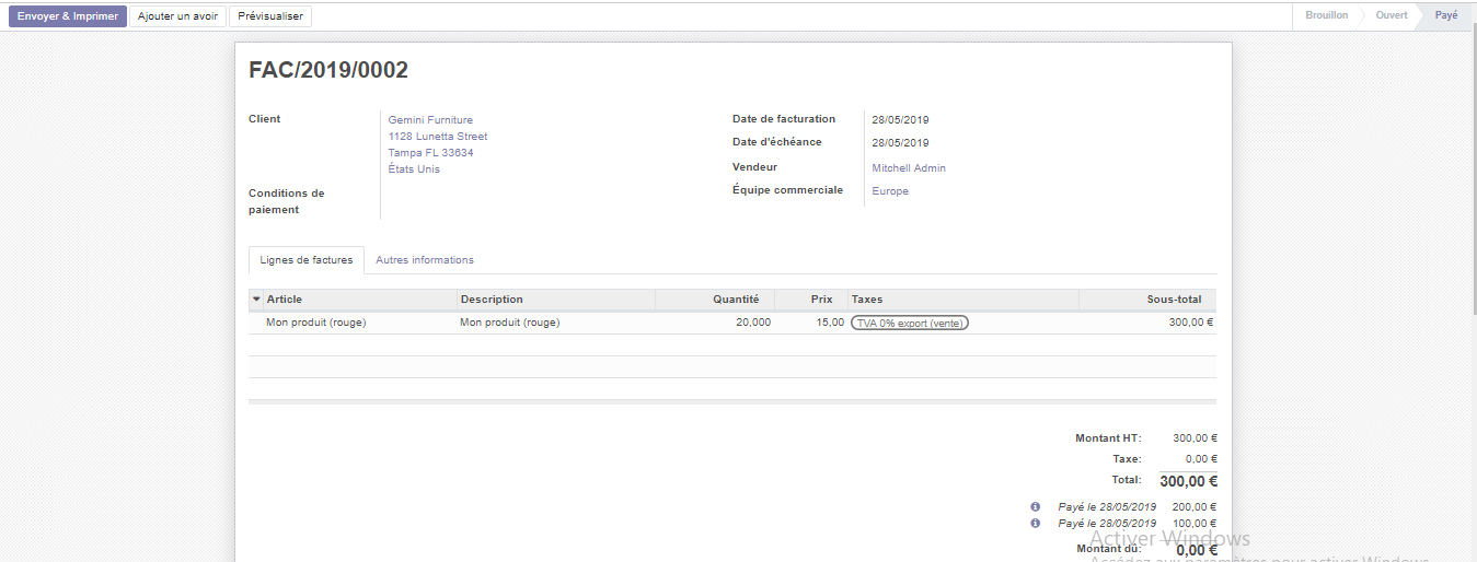 Pour suivre vos paiements reçus, cliquez sur "enregistrer un paiement" et saisissez le montant. Une fois que la totalité du solde a été réglé, votre facture passe à l'état "payé".