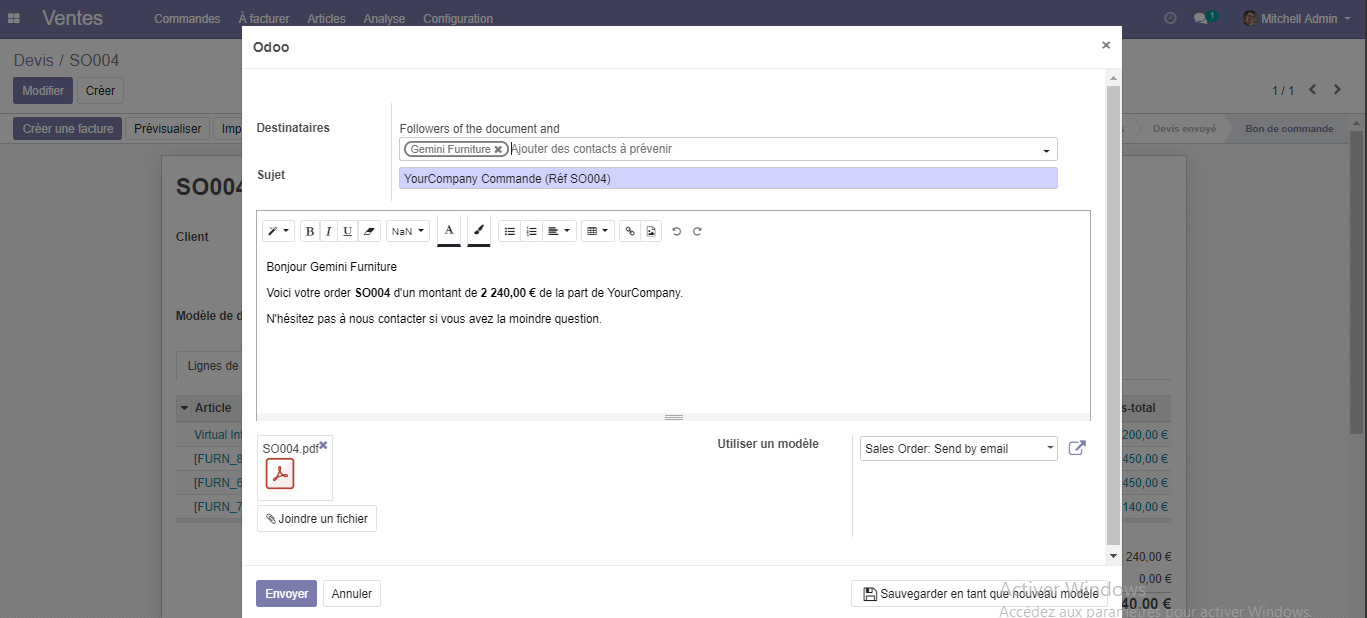 Cliquez sur "envoyer par mail" pour envoyer automatiquement un courriel à votre client avec le devis en pièce jointe. Vous pouvez régler le corps du message avant de l'envoyer. Il est possible de créer de multiples modèles d'emails afin de les réutiliser.